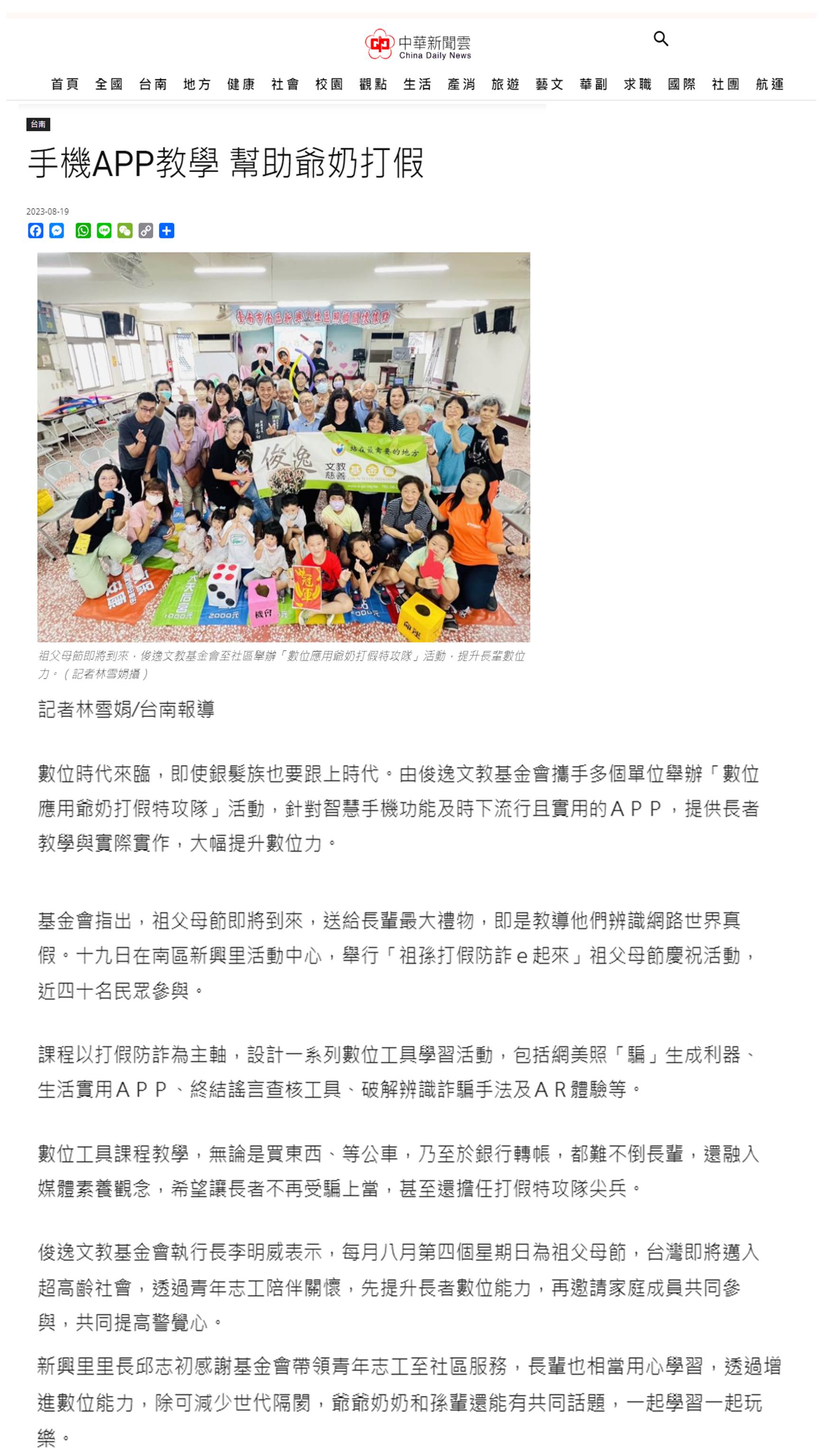 む中華日報め手機APP教學 幫助爺奶打假::俊逸文教基金會::