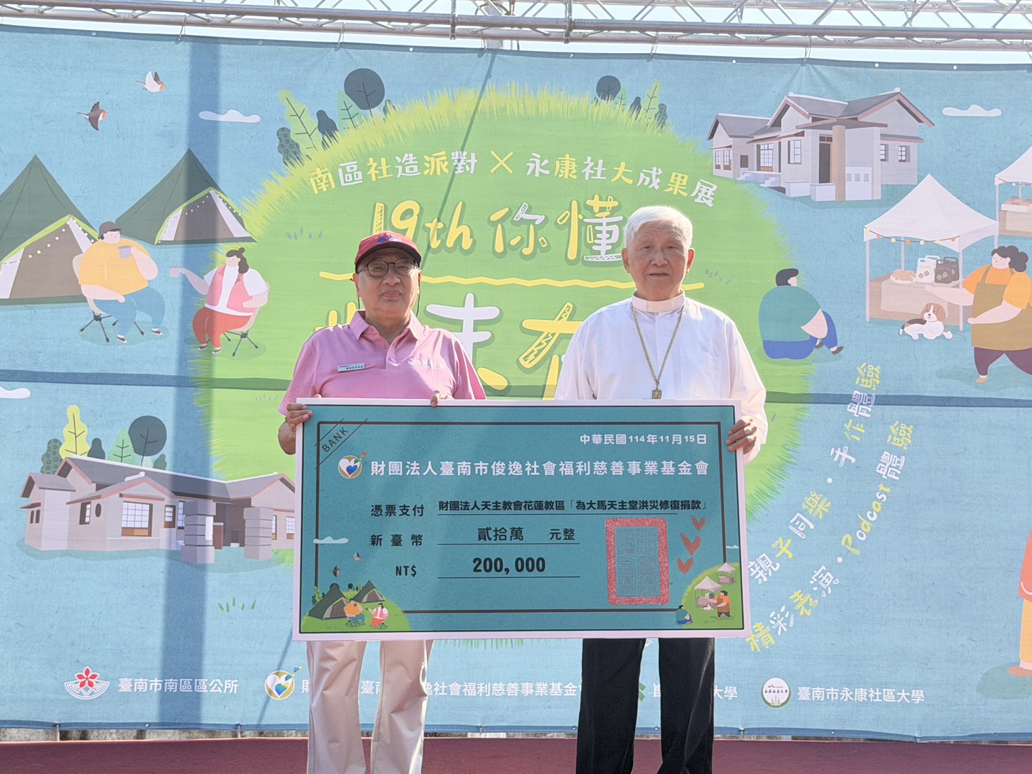 活動開幕式中,俊逸慈善基金會以非營利機構的領頭羊角色展現社會關懷,由董事長李明威代表捐贈新台幣20萬元予天主教花蓮教區,用以支持「花蓮馬太鞍天主堂災後重建」。花蓮地區日前受堰塞湖溢流影響,光復鄉馬太鞍村災情嚴重,馬太鞍天主堂與周邊部落遭洪水侵襲,損失慘重。日前李董事長遠在他鄉的家人們得知災情後,秉持俊逸基金會「站在最需要的地方」的宗旨,主動響應捐款行動,以實際行動傳遞關懷、拋磚引玉,期盼協助災區教堂修繕與重建。捐贈儀式由天主教榮休主教林吉男代表接受。