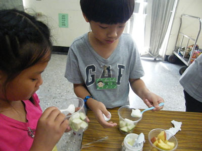 這次營隊一起同行的他校志工個個身懷絕技,設計的課程也都非常多元有趣,其中有一位志工負責設計健康飲食的課程,水果ABC這堂課是有關健康議題,課程裡面會講到水果的營養成分、富含的維生素有哪些…等,更規劃讓小朋友自己動手做水果優格,小朋友的反應非常熱絡,每個人都搶著要多一點水果,點綴自己手中的那杯優格,製作完後小朋友也都吃的很開心,還一直說要多吃蘋果,因為在上課時有學到蘋果富含維生素C,所以要多吃,讓自己身體抵抗力變好!放學後,小朋友們也都紛紛圍著我們說還想多吃水果來補充營養,更有小朋友跟我們分享他們家裡自己就有種很多水果,有香蕉、蓮霧、木瓜及葡萄…等,希望透過我們帶的課程小朋友回到家後可以告訴家裡的人多吃水果的益處。