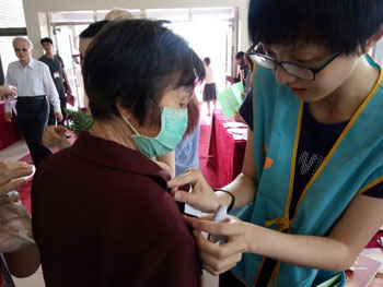 我們擔任志工的任務就是,要接待手中拿到號碼的那對佳偶和他們的親友入場到所安排的座位上就坐,頒獎時引導他們到舞台旁邊等候,頒獎合影結束,再協助他們下台階回座。而活動一開始則是要先在簽到的地方等候,阿公阿嬤到場時,幫忙阿公阿嬤貼號碼貼紙、別胸花,再給陪伴的家屬花束、號碼舉牌及兩本手冊。