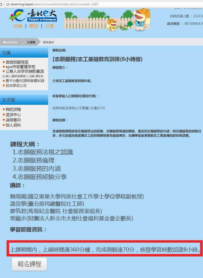 下載:臺北e大數位學習網[志願服務]志工基礎教育訓練線上操作步驟(電腦版)(另開視窗)