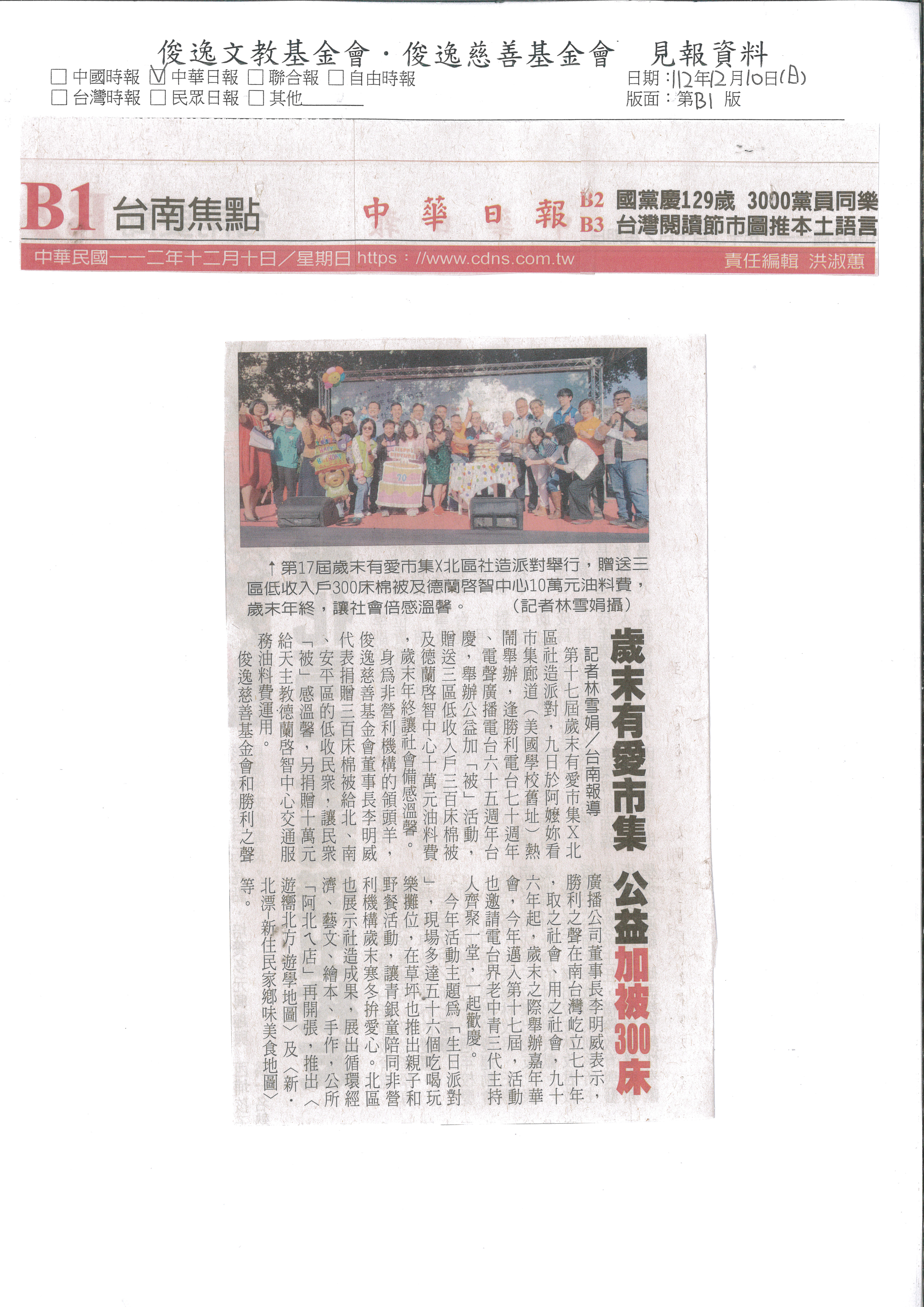 む中華日報め歲末有愛市集 公益加被300床::俊逸文教基金會::