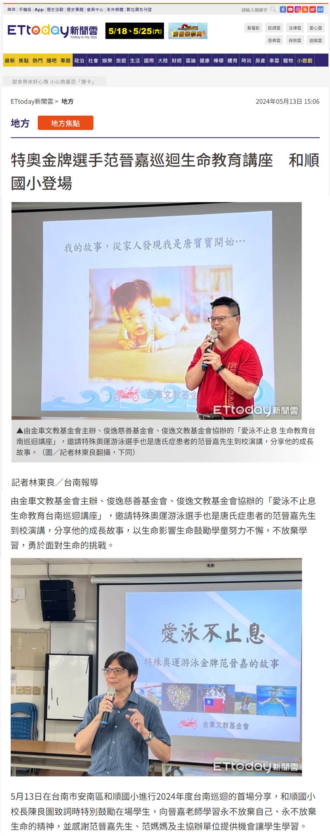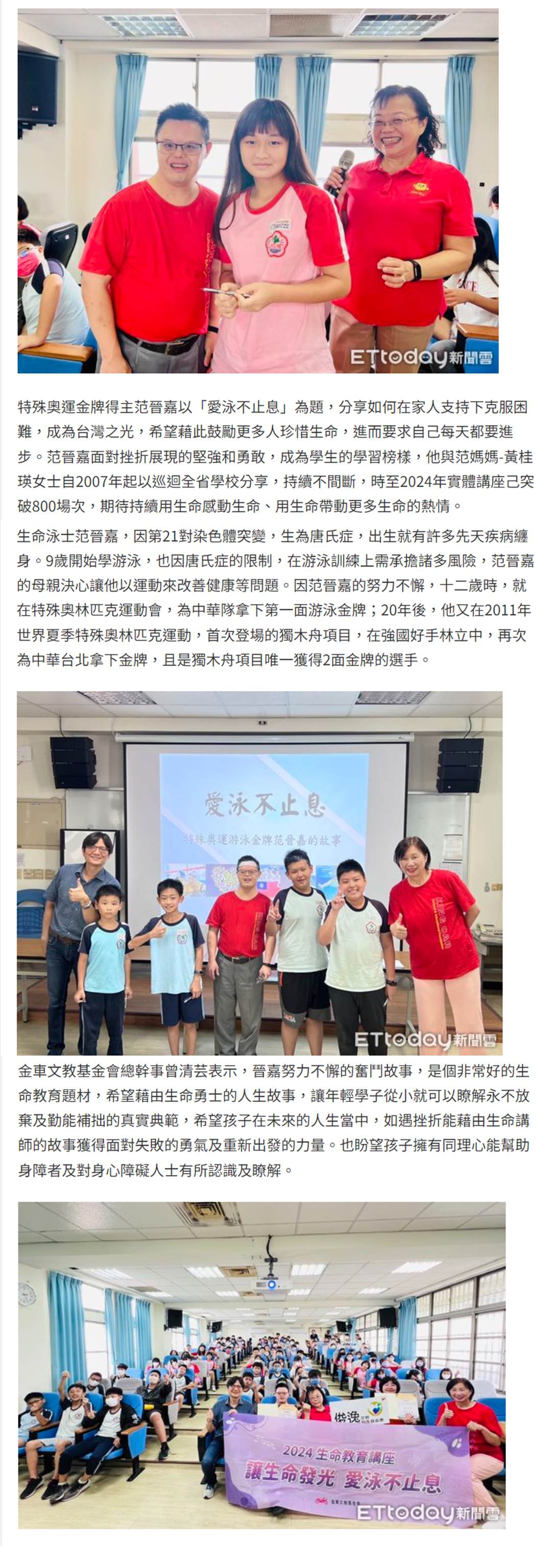 むETtoday新聞雲め特奧金牌選手范晉嘉巡迴生命教育講座 和順國小登場::俊逸文教基金會::