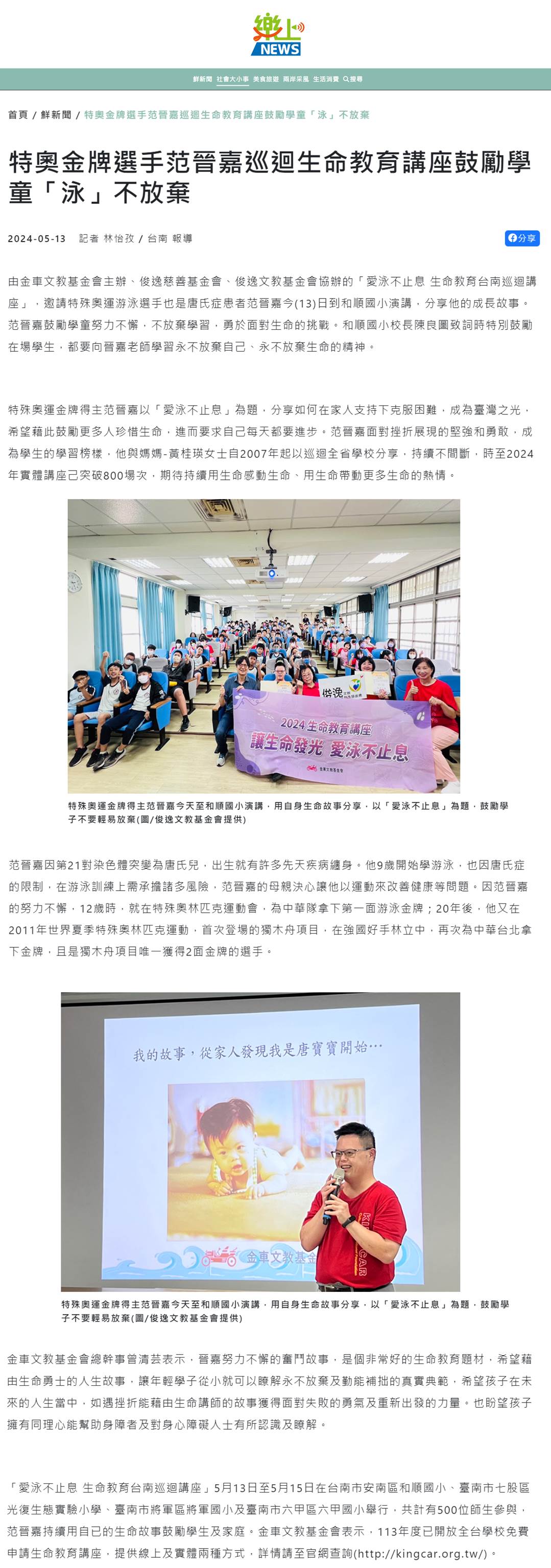 む樂上新聞め特奧金牌選手范晉嘉巡迴生命教育講座鼓勵學童「泳」不放棄::俊逸文教基金會::