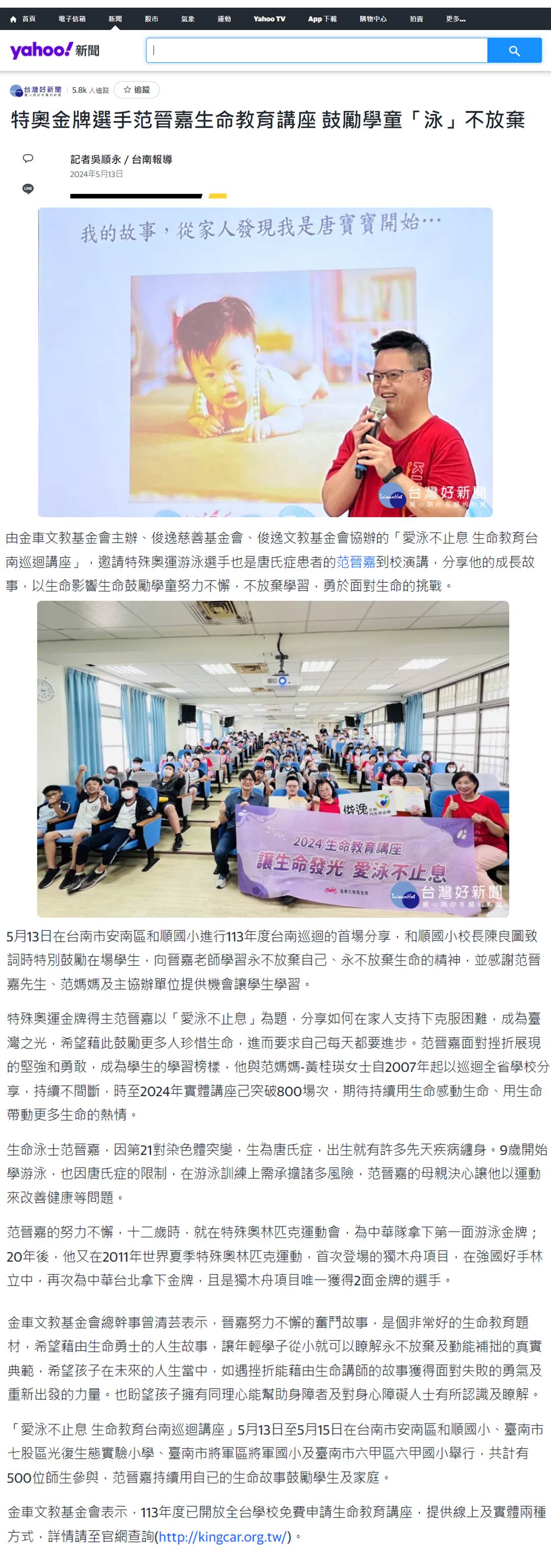 むYahoo奇摩新聞め特奧金牌選手范晉嘉生命教育講座 鼓勵學童「泳」不放棄::俊逸文教基金會::