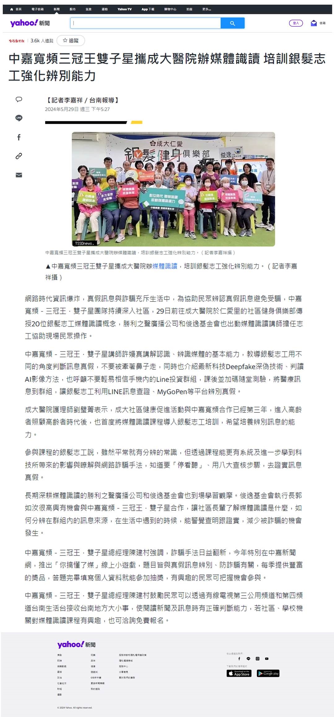 むYahoo!新聞め中嘉寬頻三冠王雙子星攜成大醫院辦媒體識讀 培訓銀髮志工強化辨別能力::俊逸文教基金會::