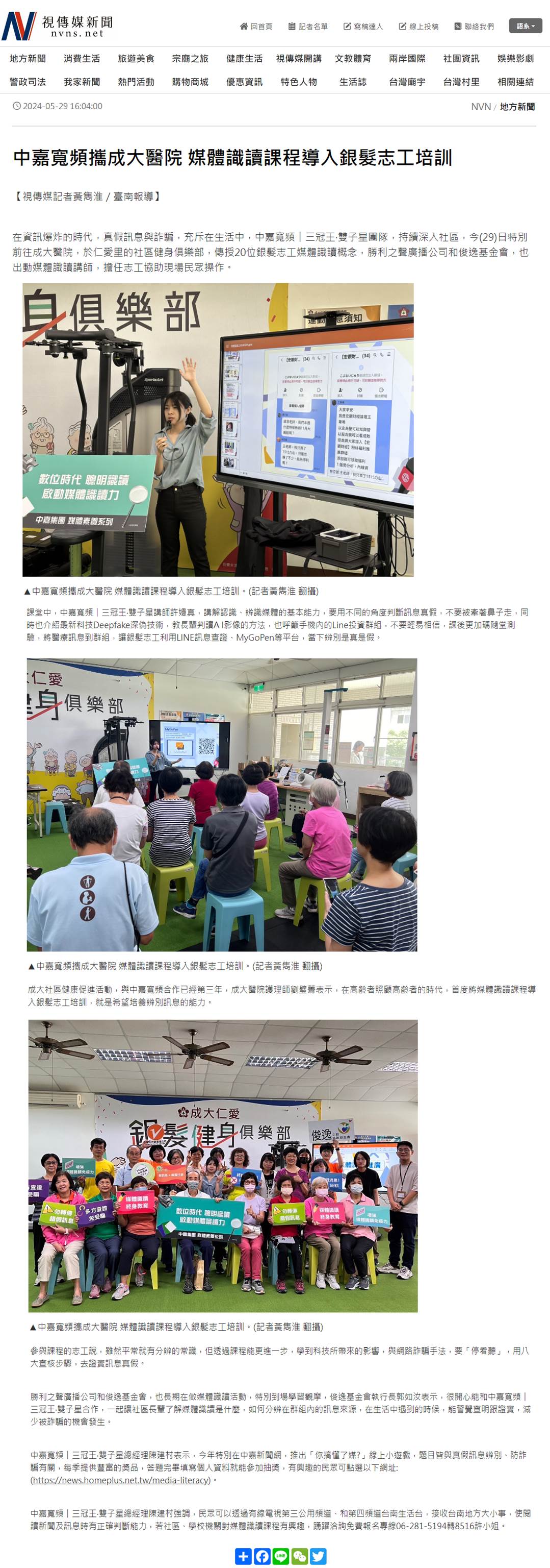 む視傳媒新聞め中嘉寬頻攜成大醫院 媒體識讀課程導入銀髮志工培訓