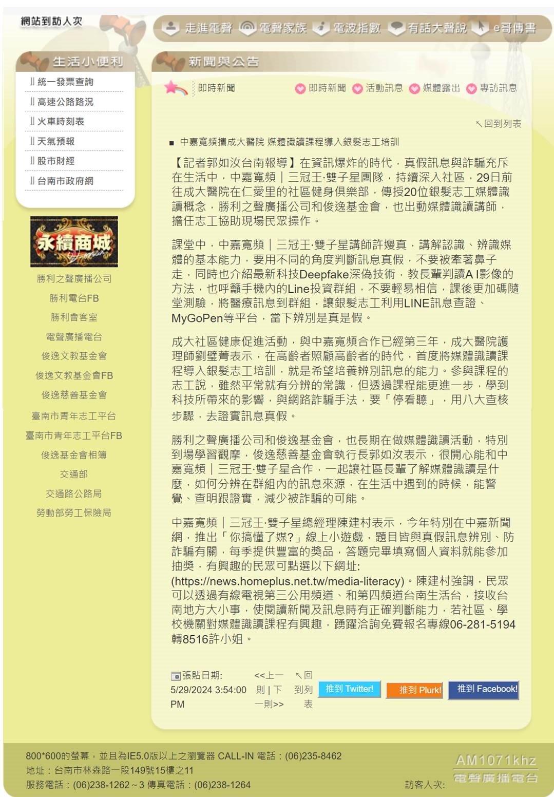 む電聲電台め中嘉寬頻攜成大醫院 媒體識讀課程導入銀髮志工培訓::俊逸文教基金會::