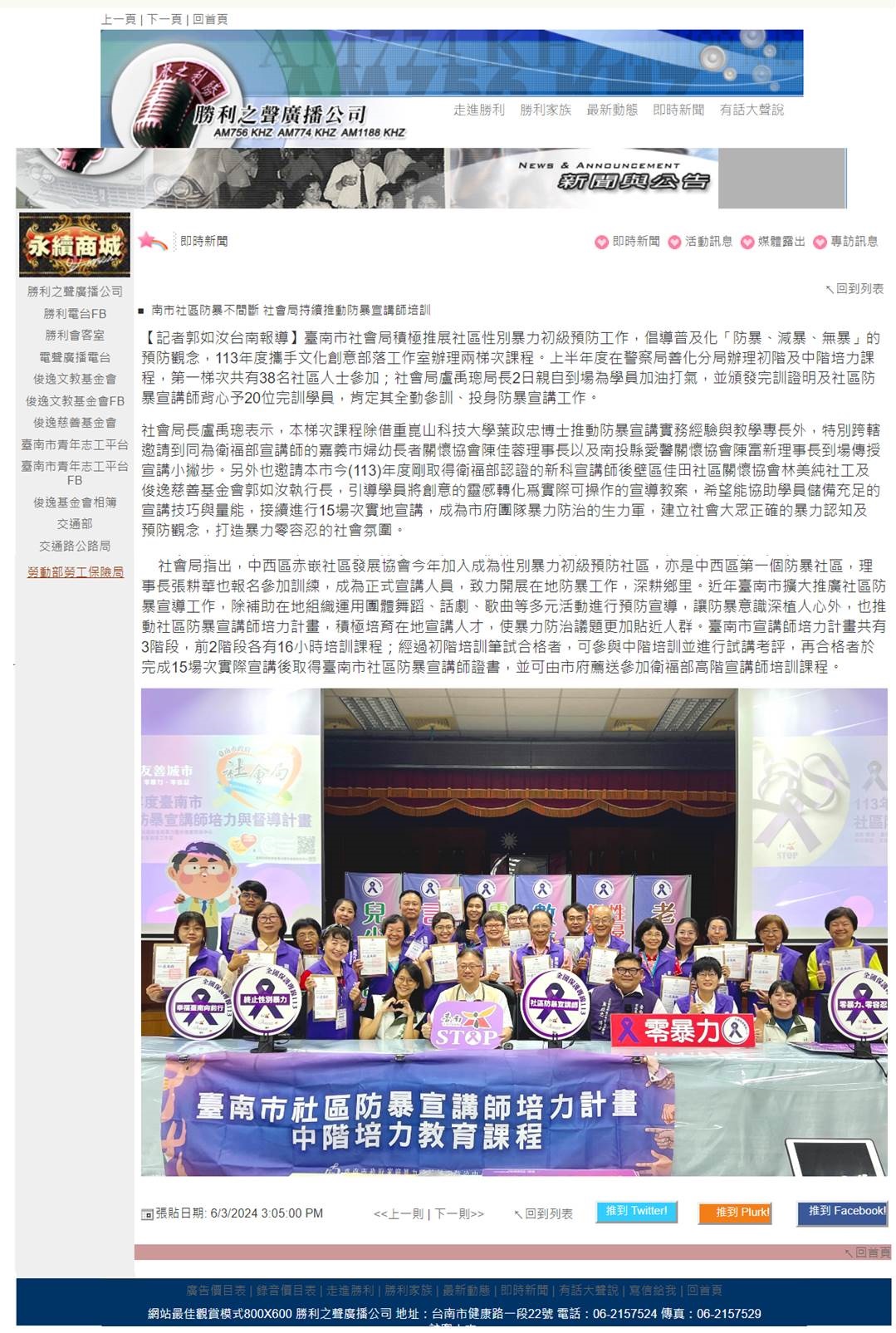 む勝利之聲廣播公司め南市社區防暴不間斷 社會局持續推動防暴宣講師培訓::俊逸文教基金會::