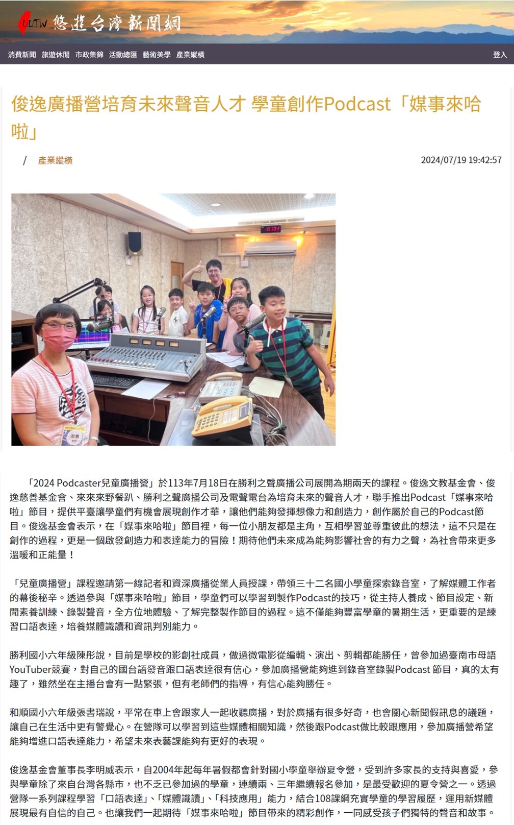 む悠遊台灣新聞網め俊逸廣播營培育未來聲音人才 學童創作Podcast「媒事來哈啦」::俊逸文教基金會::