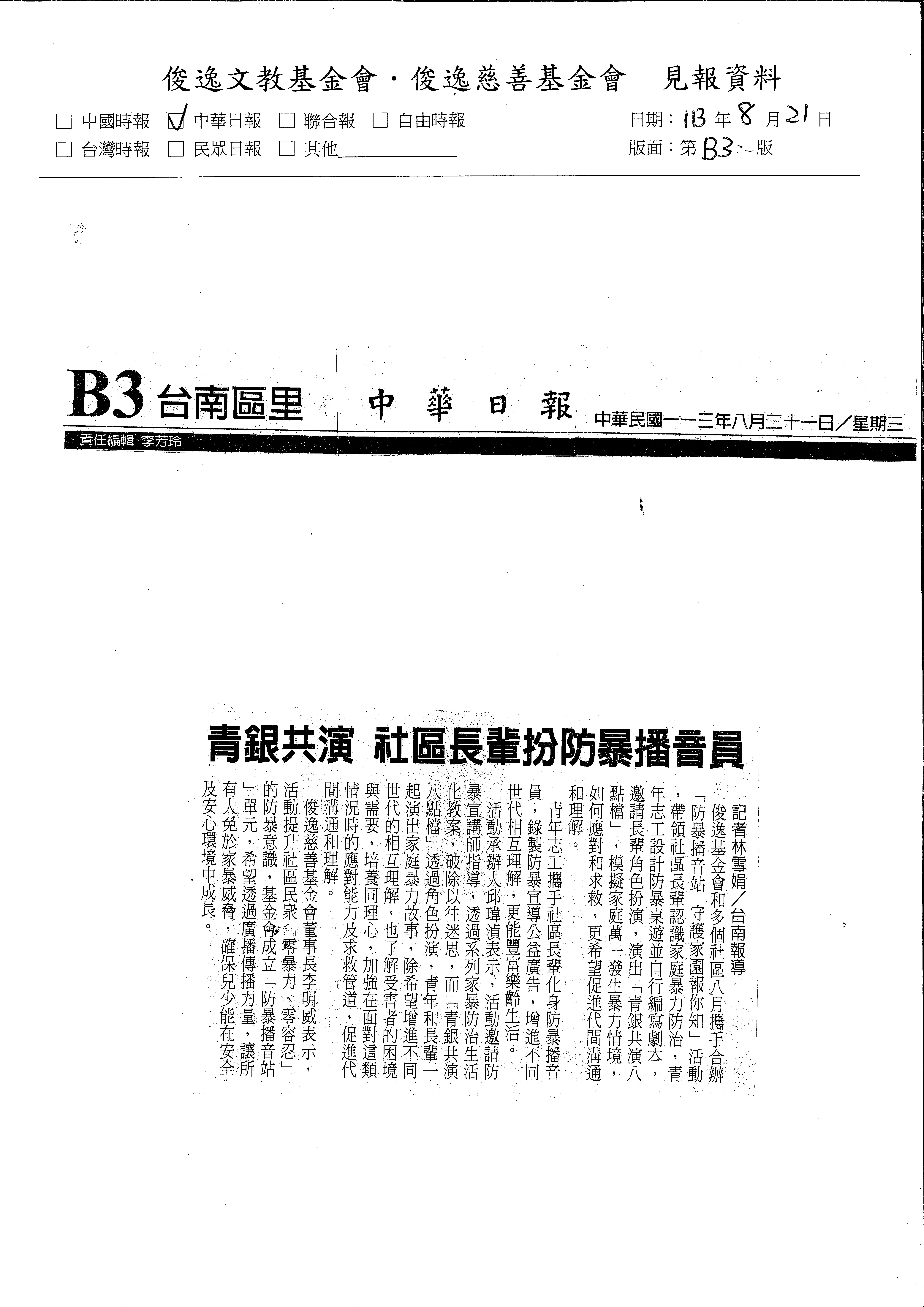 む中華日報め青銀共演 社區長輩扮防暴播音員::俊逸文教基金會::