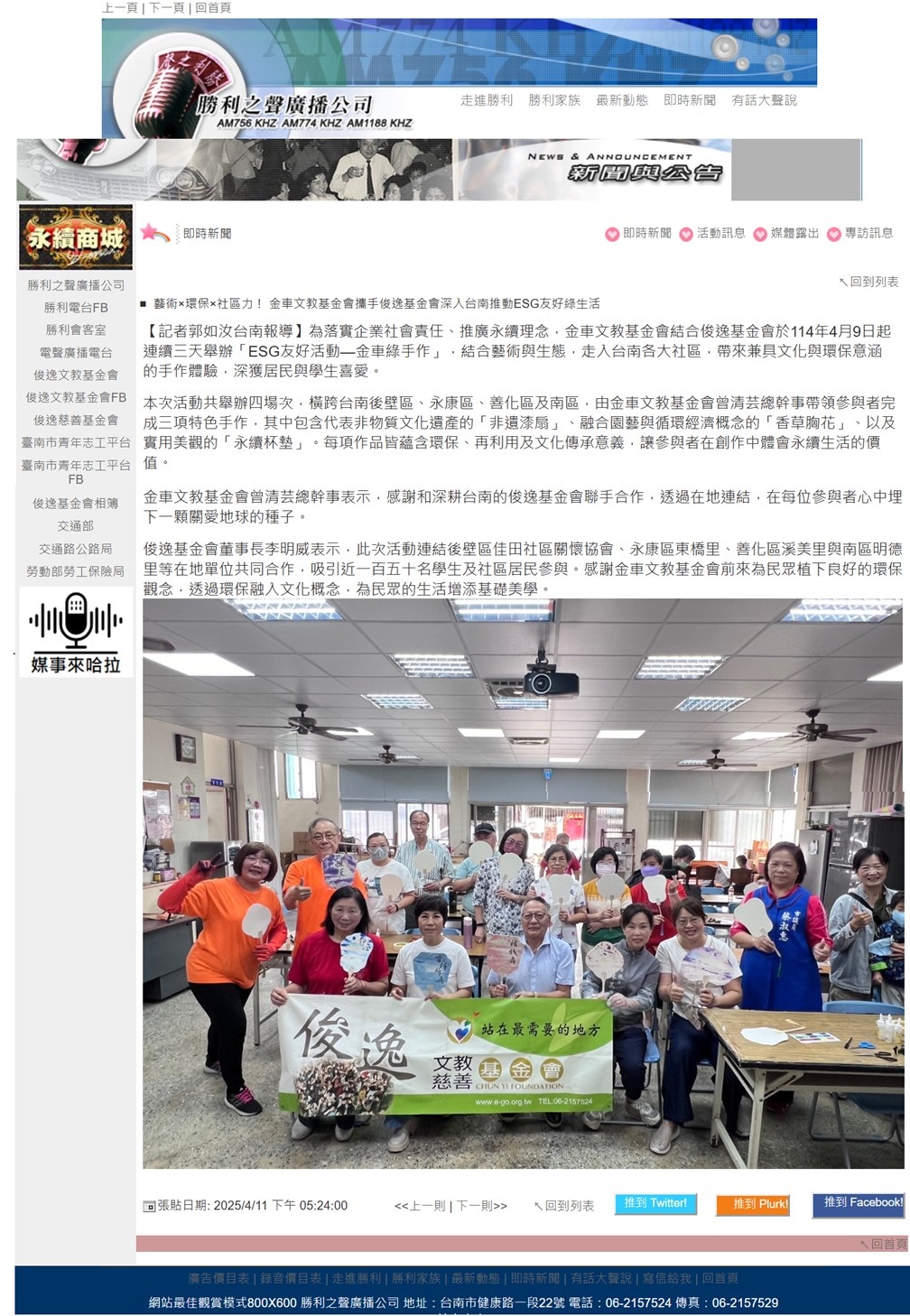 む勝利之聲廣播公司め藝術×環保×社區力! 金車文教基金會攜手俊逸基金會深入台南推動ESG友好綠生活::俊逸文教基金會::