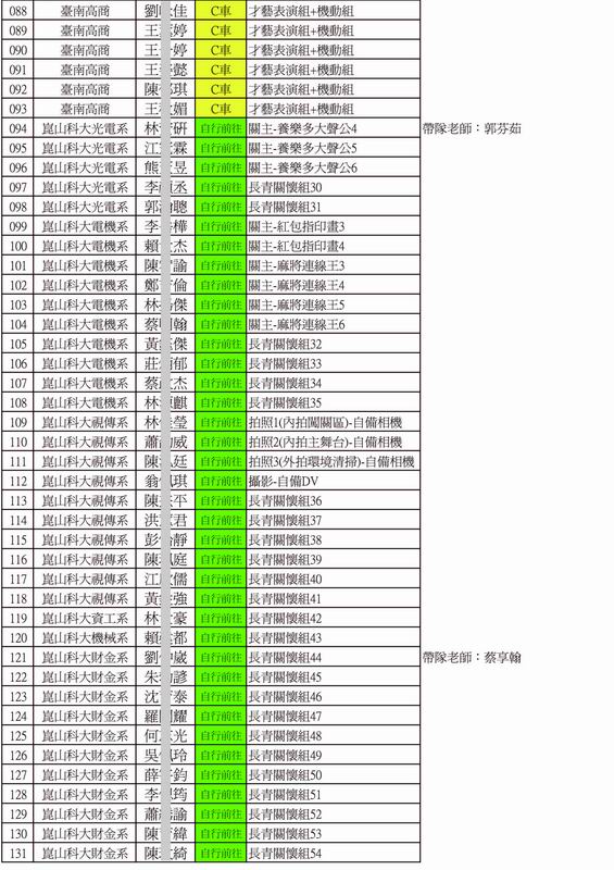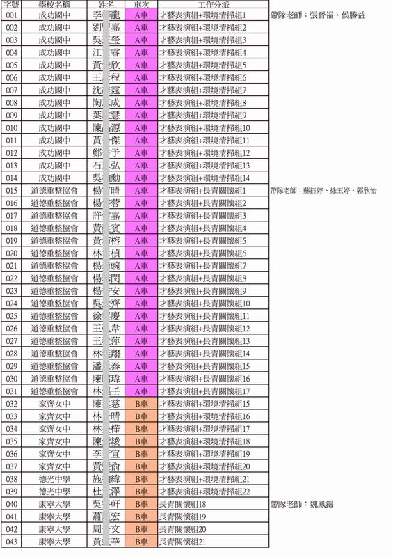 ★搭乘A車請找林明玲小姐、B車找郭如汝小姐、C車找洪碧涓小姐0911-731399(車次請看下表的錄取名單內有標示),一早抵達二中公園北路的校門口時,請同學各自找本會工作人員報到,以利加快簽到速度!