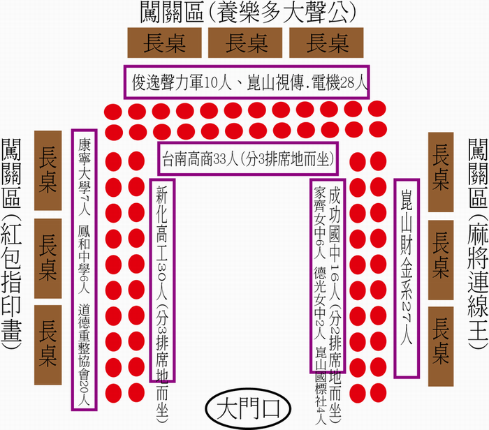 329開幕式09:40-10:20,有一事需要各單位、學校配合!當主持人唱名到**學校時,請同學們揮動學校或系上或社團的旗幟,並呼喊一下精神口號(口號的部分以台南高商為例,例如:南商志工,服務最多!南商國樂,演奏最強!南商熱舞,青春無限!南商儀隊,精彩非凡!臺南高商,熱情如火! YA!...之類的)請各單位、學校各自發揮創意想一個,當天主持人唱名到單位名稱時,請大聲呼喊出來,讓貴賓及養護中心長輩們看見各校同學們的熱情與活力。開幕式時,各單位學校的位置圖如下所示:
