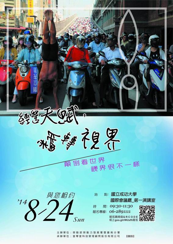 透過倒立先生的藝術與社會企業創業的故事,分享如何經營天賦、擁抱夢想以及分享倒立先生眼中的寶貝台灣,進而邀請大家一起喚起心中的夢想藍圖。 |