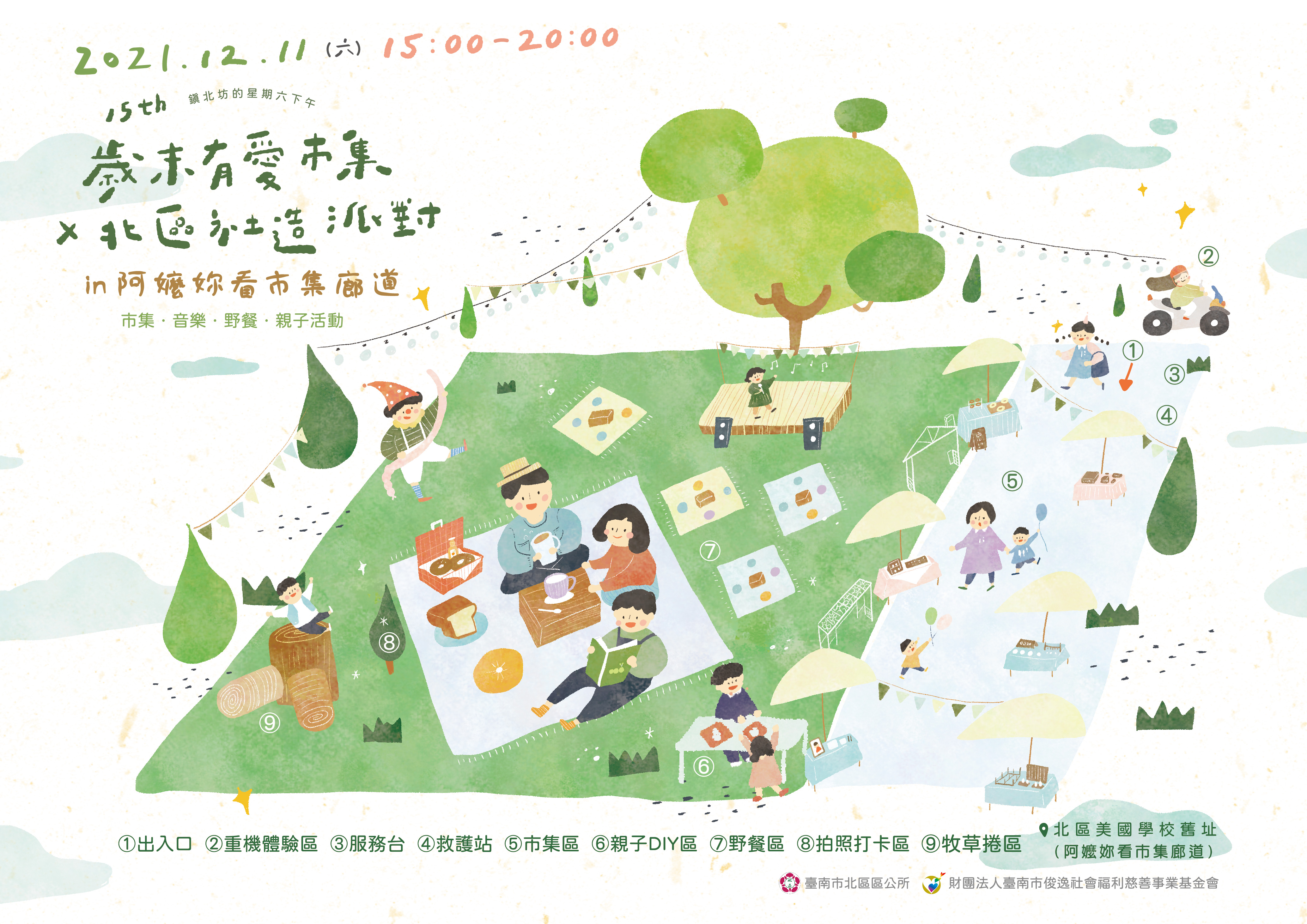 由臺南市北區區公所、俊逸慈善基金會主辦,崑山科技大學、臺南青年志工中心、俊逸文教基金會、勝利之聲廣播公司、電聲廣播電台、北區振興社區發展協會等單位合辦的「第十五屆歲末有愛市集X北區社造派對」,將於110/12/11下午三時至晚上八時在台南市北區美國學校舊址(阿嬤妳看市集廊道)登場,推出五十五個吃喝玩樂攤位,展現非營利組織及社區營造的多元風貌;舞台區十八個不間斷的精彩表演節目,陪同非營利機構歲末寒冬拼愛心;並首度連結崑山科技大學、臺南青年志工中心邀請專業團隊規劃整體空間營造及活動當日將提供80組「聖誕野餐趴」免費體驗,希望能夠讓民眾暫時遠離3C,一同到戶外享受難得的綠地;更規劃多項闖關遊戲、聖誕裝置藝術打卡換禮物的任務等您來挑戰,期待民眾蒞臨吃喝玩樂、拿禮物外,更能做公益。